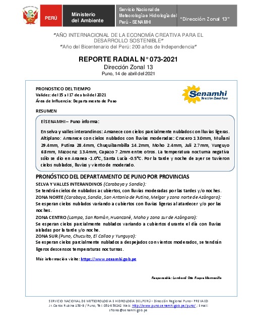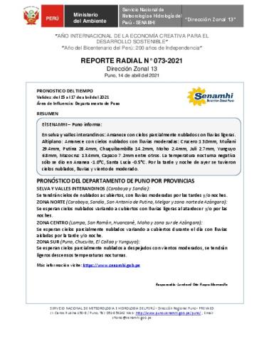 SENAMHI-DZ13 Puno: Reporte radial del 14 de abril del 2021
