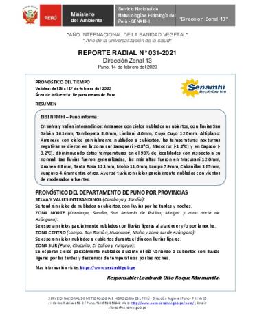 SENAMHI-DZ13 Puno: Reporte radial de 14 de febrero del 2021