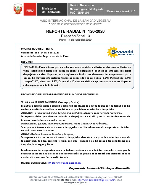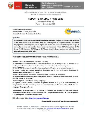 SENAMHI-DZ13 Puno: Reporte radial de 14 de junio del 2020