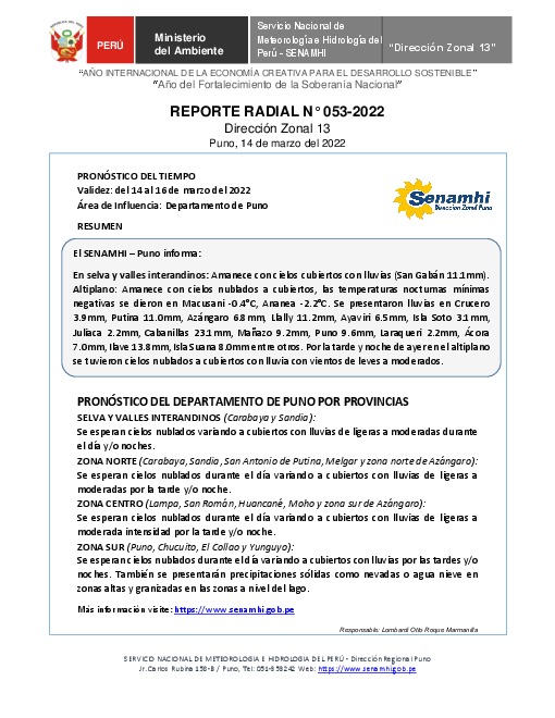 SENAMHI-DZ13 Puno: Reporte radial del 14 de marzo del 2022