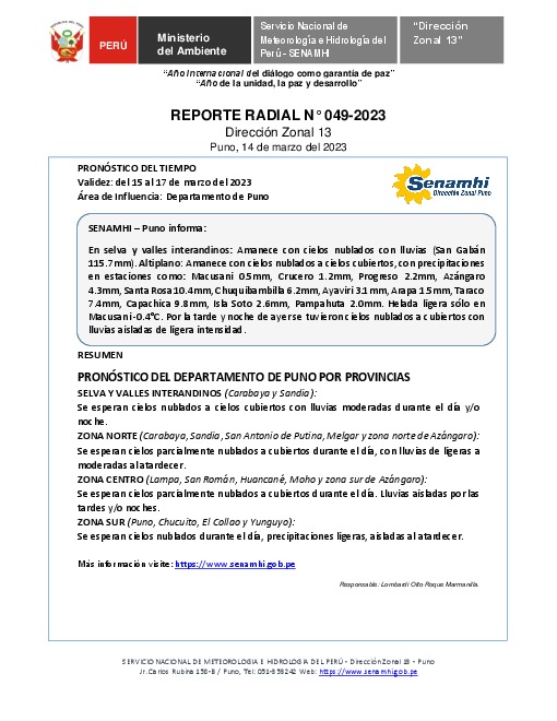 SENAMHI-DZ13 Puno: Reporte radial del 14 de marzo del 2023