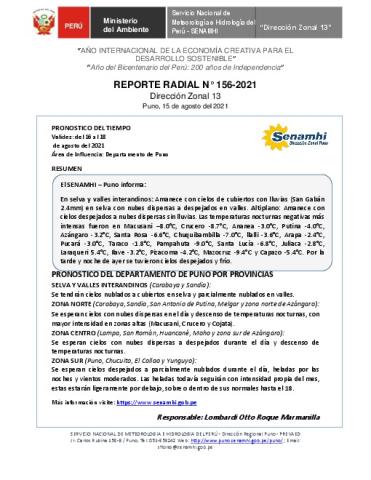 SENAMHI-DZ13 Puno: Reporte radial del 15 de agosto del 2021