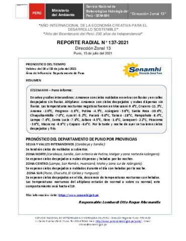 SENAMHI-DZ13 Puno: Reporte radial del 15 de julio del 2021