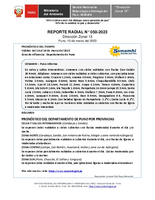 SENAMHI-DZ13 Puno: Reporte radial del 15 de marzo del 2023