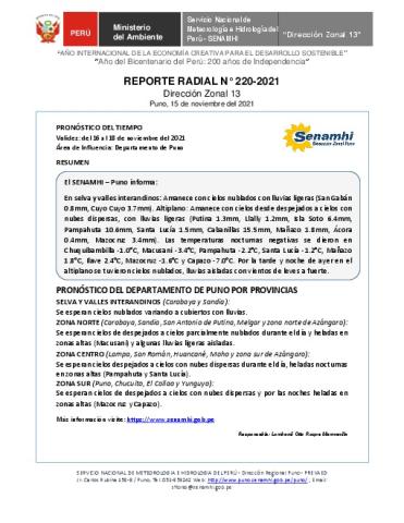 SENAMHI-DZ13 Puno: Reporte radial del 15 de noviembre del 2021