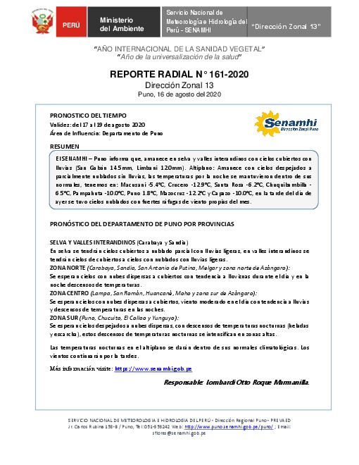 SENAMHI-DZ13 Puno: Reporte radial de 16 de agosto del 2020
