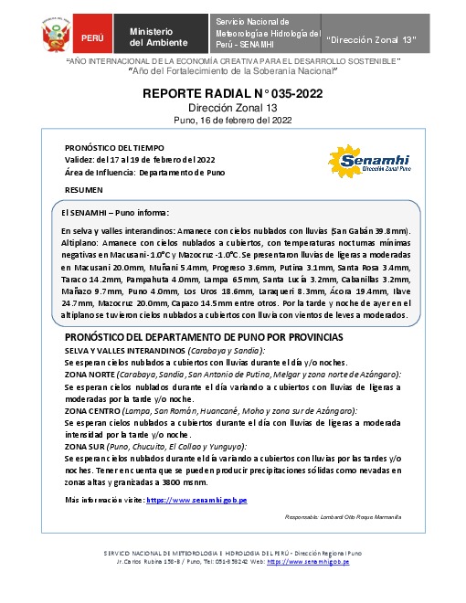 SENAMHI-DZ13 Puno: Reporte radial del 16 de febrero del 2022