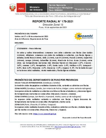 SENAMHI-DZ13 Puno: Reporte radial del 16 de septiembre del 2021