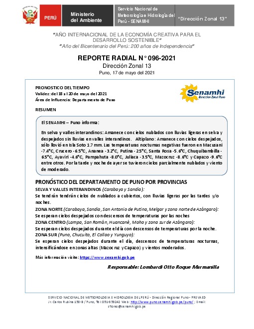 SENAMHI-DZ13 Puno: Reporte radial del 17 de mayo del 2021