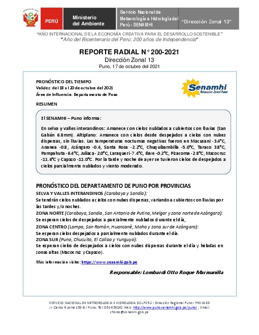 SENAMHI-DZ13 Puno: Reporte radial del 17 de octubre del 2021