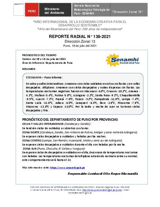 SENAMHI-DZ13 Puno: Reporte radial del 18 de julio del 2021