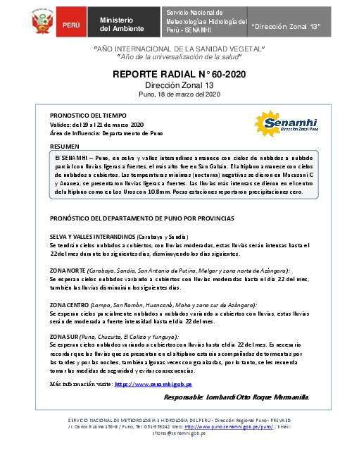 SENAMHI-DZ13 Puno: Reporte radial de 18 de marzo del 2020