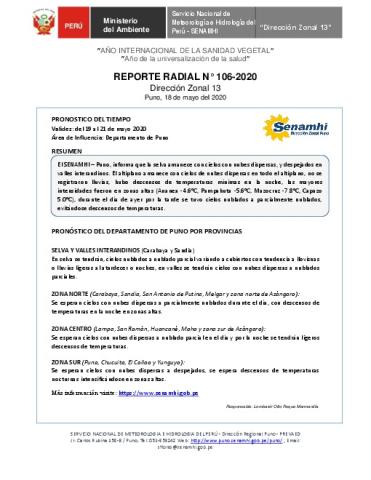 SENAMHI-DZ13 Puno: Reporte radial de 18 de mayo del 2020