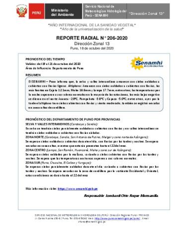 SENAMHI-DZ13 Puno: Reporte radial de 18 de octubre del 2020