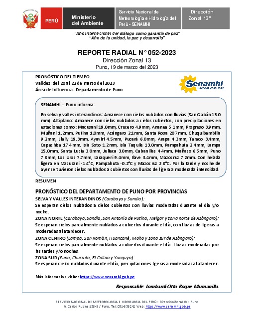 SENAMHI-DZ13 Puno: Reporte radial del 19 de marzo del 2023