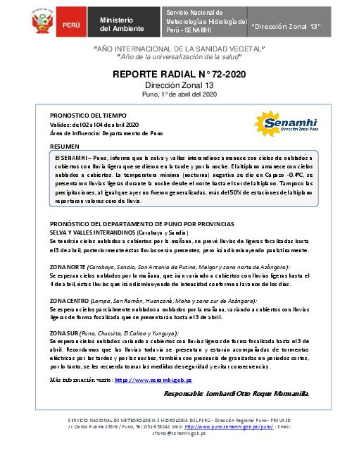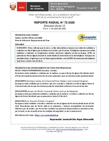 SENAMHI-DZ13 Puno: Reporte radial de 1° de abril del 2020