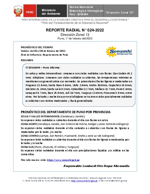 SENAMHI-DZ13 Puno: Reporte radial del 1° de febrero del 2022
