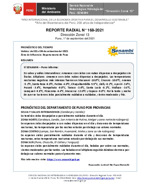 SENAMHI-DZ13 Puno: Reporte radial del 1° de septiembre del 2021