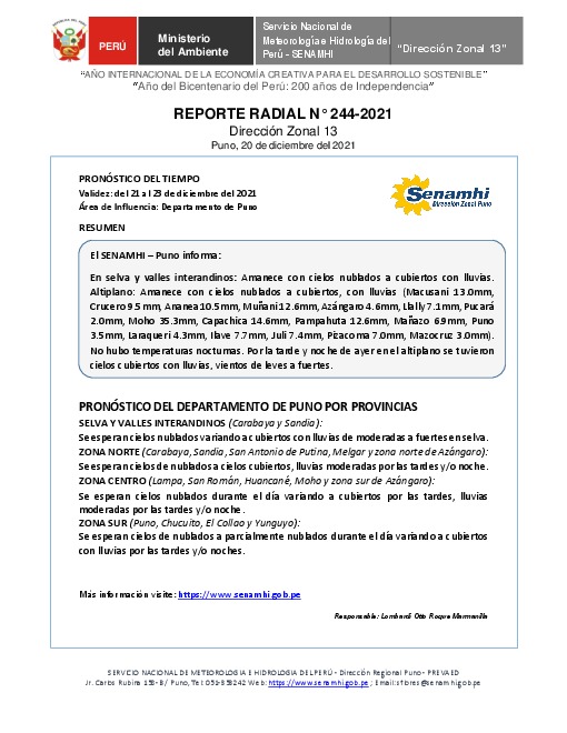 SENAMHI-DZ13 Puno: Reporte radial del 20 de diciembre del 2021