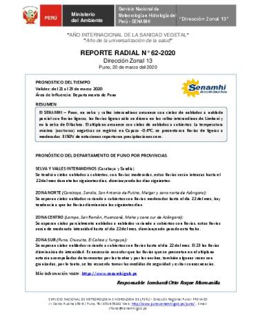 SENAMHI-DZ13 Puno: Reporte radial de 20 de marzo del 2020