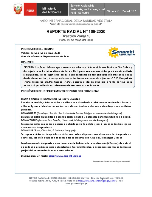 SENAMHI-DZ13 Puno: Reporte radial de 20 de mayo del 2020