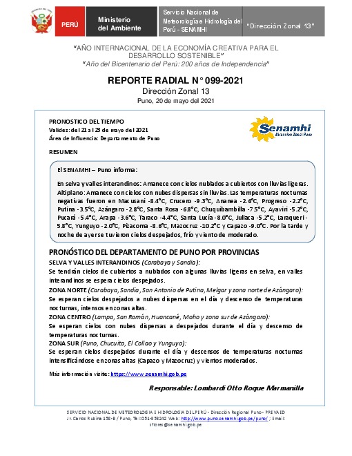 SENAMHI-DZ13 Puno: Reporte radial del 20 de mayo del 2021