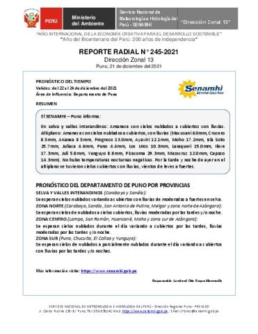 SENAMHI-DZ13 Puno: Reporte radial del 21 de diciembre del 2021