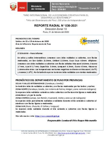SENAMHI-DZ13 Puno: Reporte radial de 21 de febrero del 2021