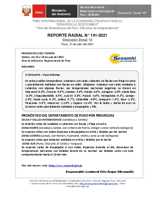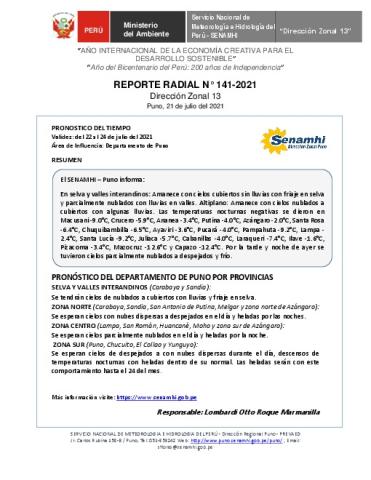 SENAMHI-DZ13 Puno: Reporte radial del 21 de julio del 2021