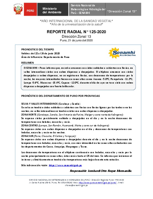 SENAMHI-DZ13 Puno: Reporte radial de 21 de junio del 2020