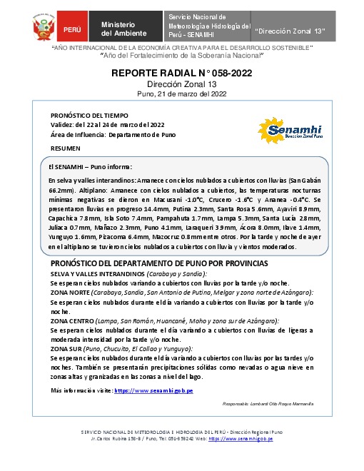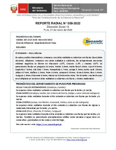 SENAMHI-DZ13 Puno: Reporte radial del 21 de marzo del 2022