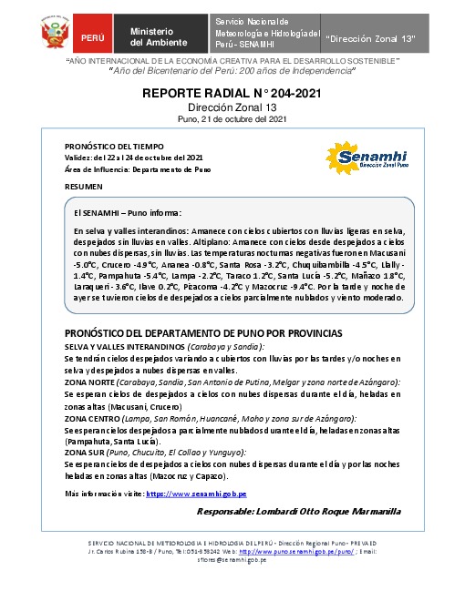 SENAMHI-DZ13 Puno: Reporte radial del 21 de octubre del 2021