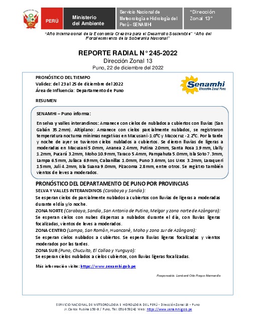 SENAMHI-DZ13 Puno: Reporte radial del 22 de diciembre del 2022