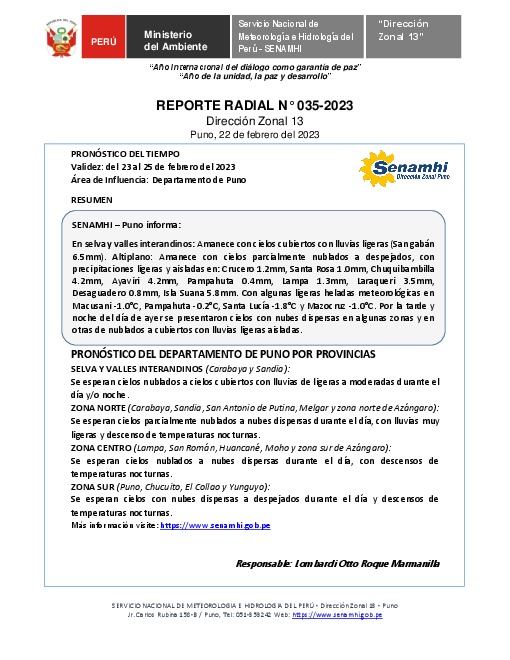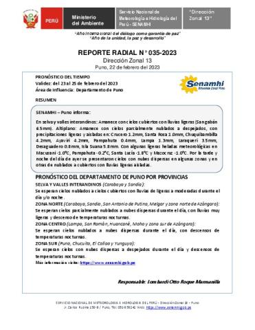 SENAMHI-DZ13 Puno: Reporte radial del 22 de febrero del 2023