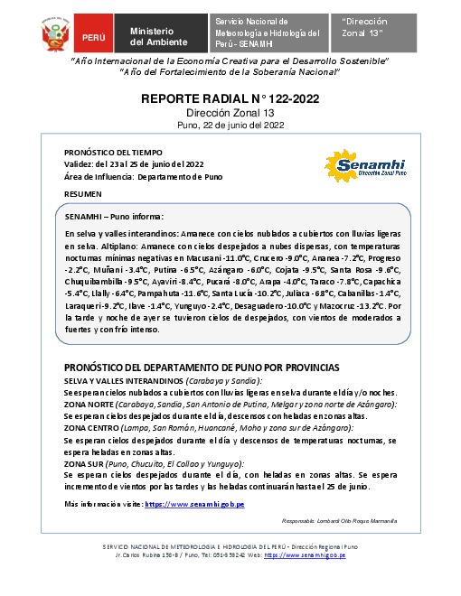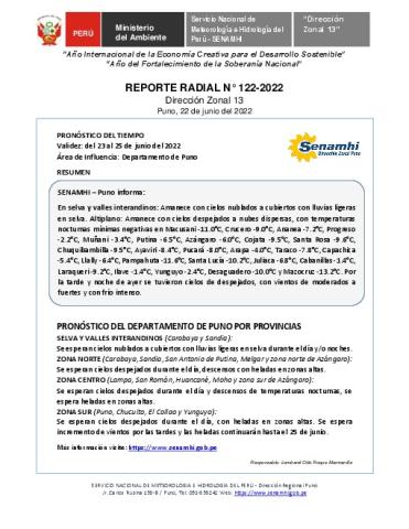 SENAMHI-DZ13 Puno: Reporte radial del 22 de junio del 2022