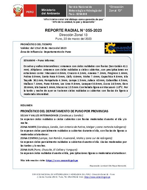 SENAMHI-DZ13 Puno: Reporte radial del 22 de marzo del 2023