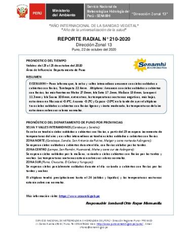 SENAMHI-DZ13 Puno: Reporte radial de 22 de octubre del 2020