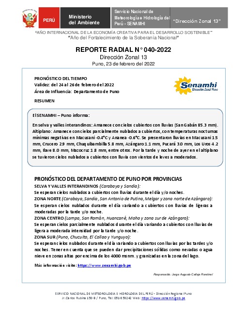 SENAMHI-DZ13 Puno: Reporte radial de 23 de febrero del 2022