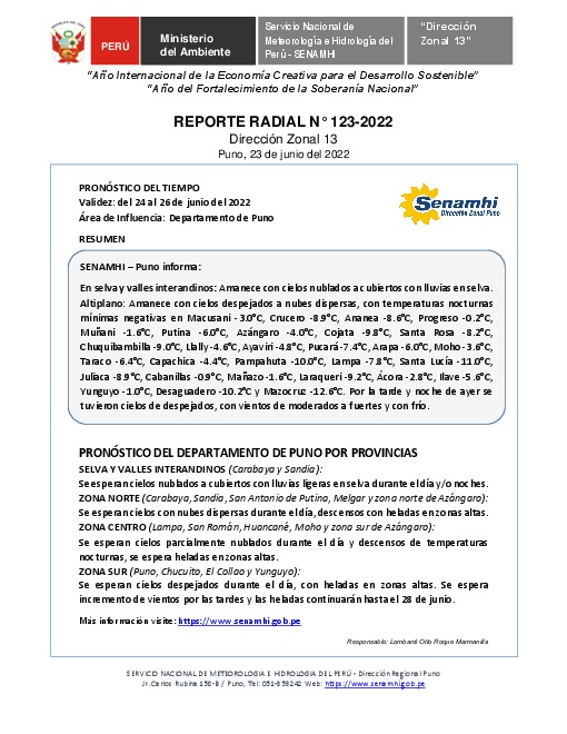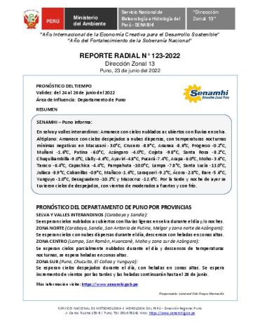 SENAMHI-DZ13 Puno: Reporte radial del 23 de junio del 2022