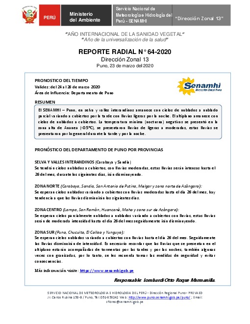 SENAMHI-DZ13 Puno: Reporte radial de 23 de marzo del 2020