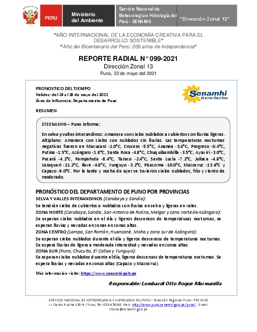 SENAMHI-DZ13 Puno: Reporte radial del 23 de mayo del 2021