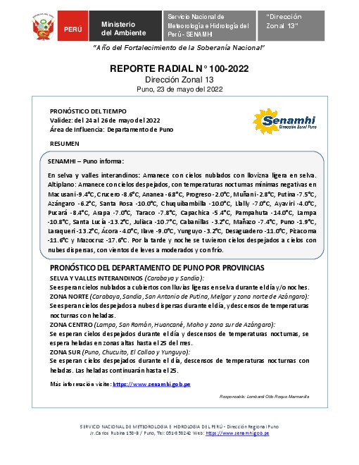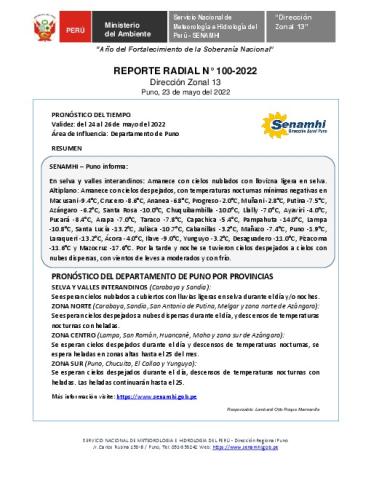 SENAMHI-DZ13 Puno: Reporte radial del 23 de mayo del 2022