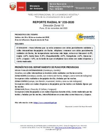 SENAMHI-DZ13 Puno: Reporte radial de 23 de noviembre del 2020