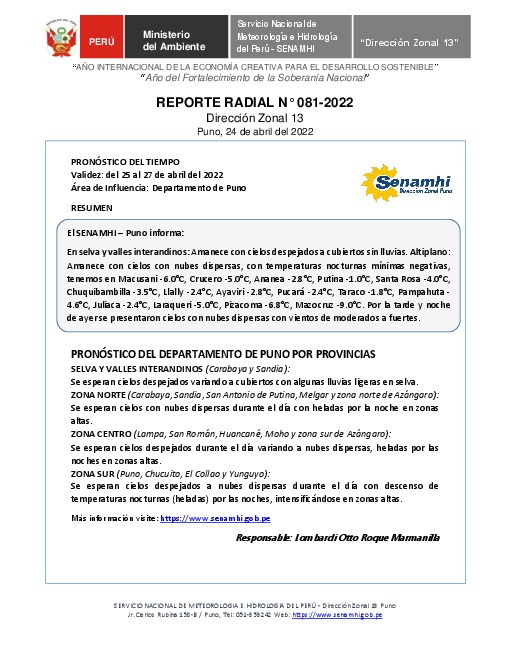 SENAMHI-DZ13 Puno: Reporte radial del 24 de abril del 2022