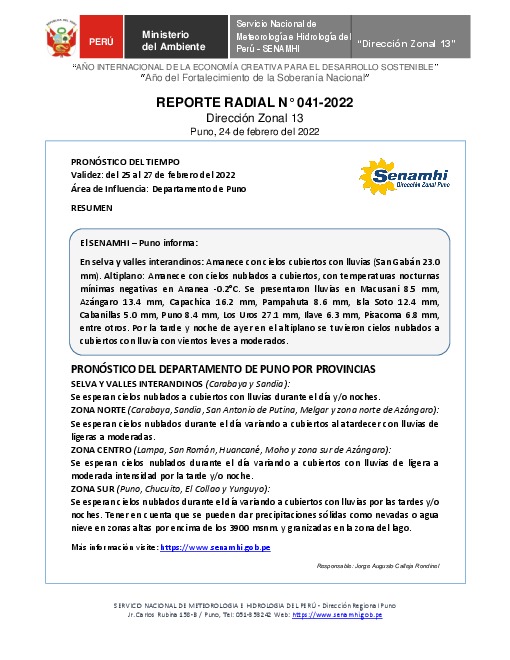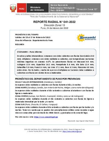SENAMHI-DZ13 Puno: Reporte radial de 24 de febrero del 2022