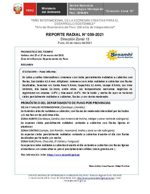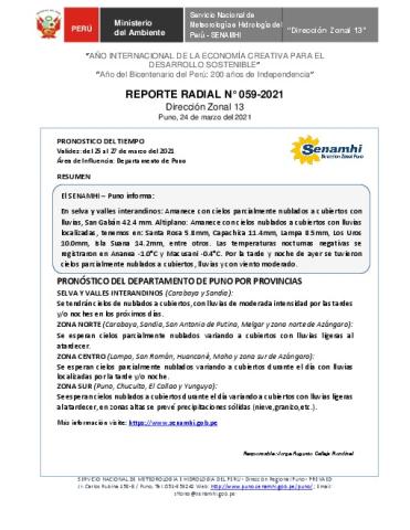 SENAMHI-DZ13 Puno: Reporte radial de 24 de marzo del 2021