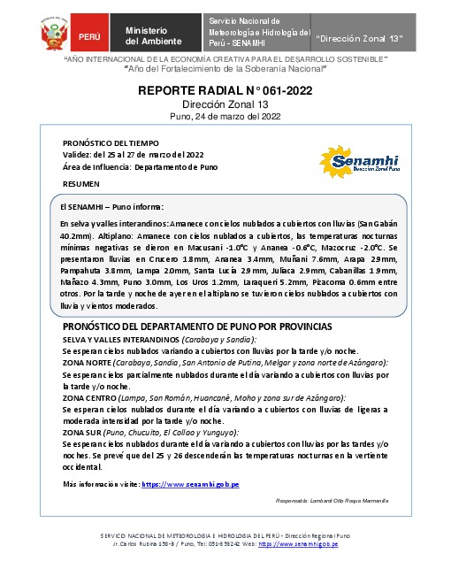 SENAMHI-DZ13 Puno: Reporte radial del 24 de marzo del 2022