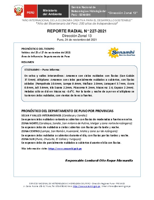SENAMHI-DZ13 Puno: Reporte radial del 24 de noviembre del 2021