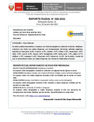 SENAMHI-DZ13 Puno: Reporte radial del 25 de abril del 2022