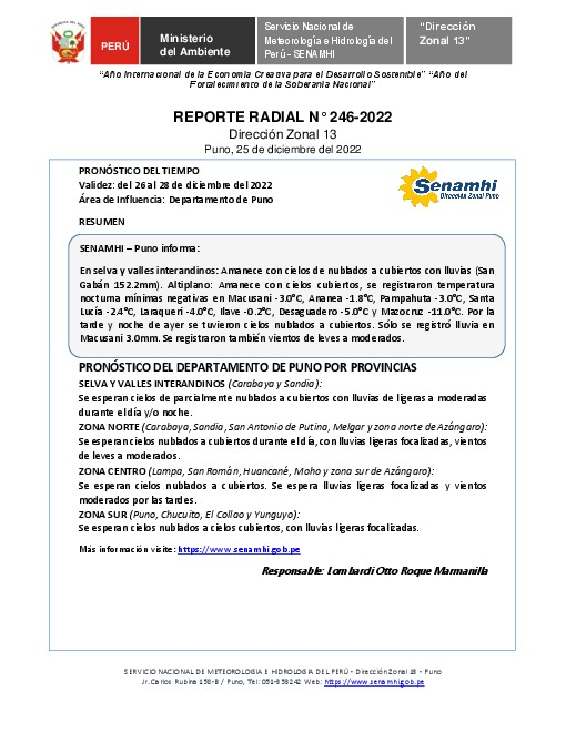 SENAMHI-DZ13 Puno: Reporte radial del 25 de diciembre del 2022